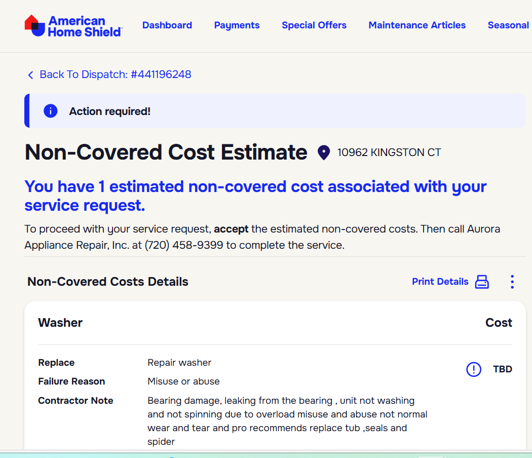Been with American Home Shield for nearly 10 years with very minimal claims to typical appliances. Paid monthly and in full with any service copay charged. When confronted with an appliance breakdown, AHS decided that they did not want to pay for the problem, even with the knowledge that two separate repair companies did investigations of the washer and stated that it would have a large amount repair or full replacement. Repair company even took video of washer showing that the drum and bearings would need to be repaired. AHS decided that they didnt want to pay for the repair/replacement as they said the washer was in fine working order and no repair was needed (even after 2 companies verified the failure). Tried to cancel my service, but was given the run around to not cancel, even AHS offering to pay for 2 months of service on them. I will never use them again, as they are thieves and take money, but do not pay out on claims. NUMEROUS people are having the same problem, to no avail.