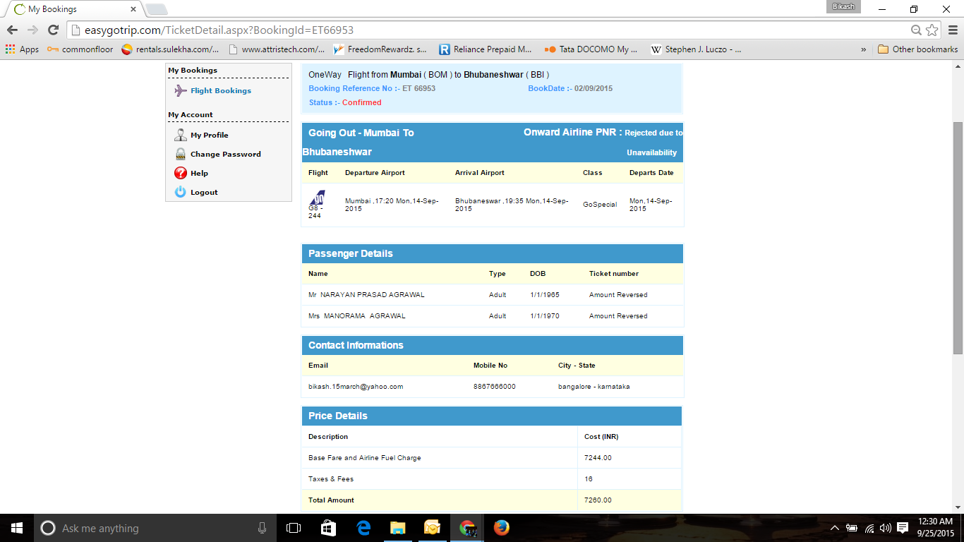 Booking was done on 02/09/15 from Mumbai to Bhubaneshwar and price charged is Rs. 7260/-