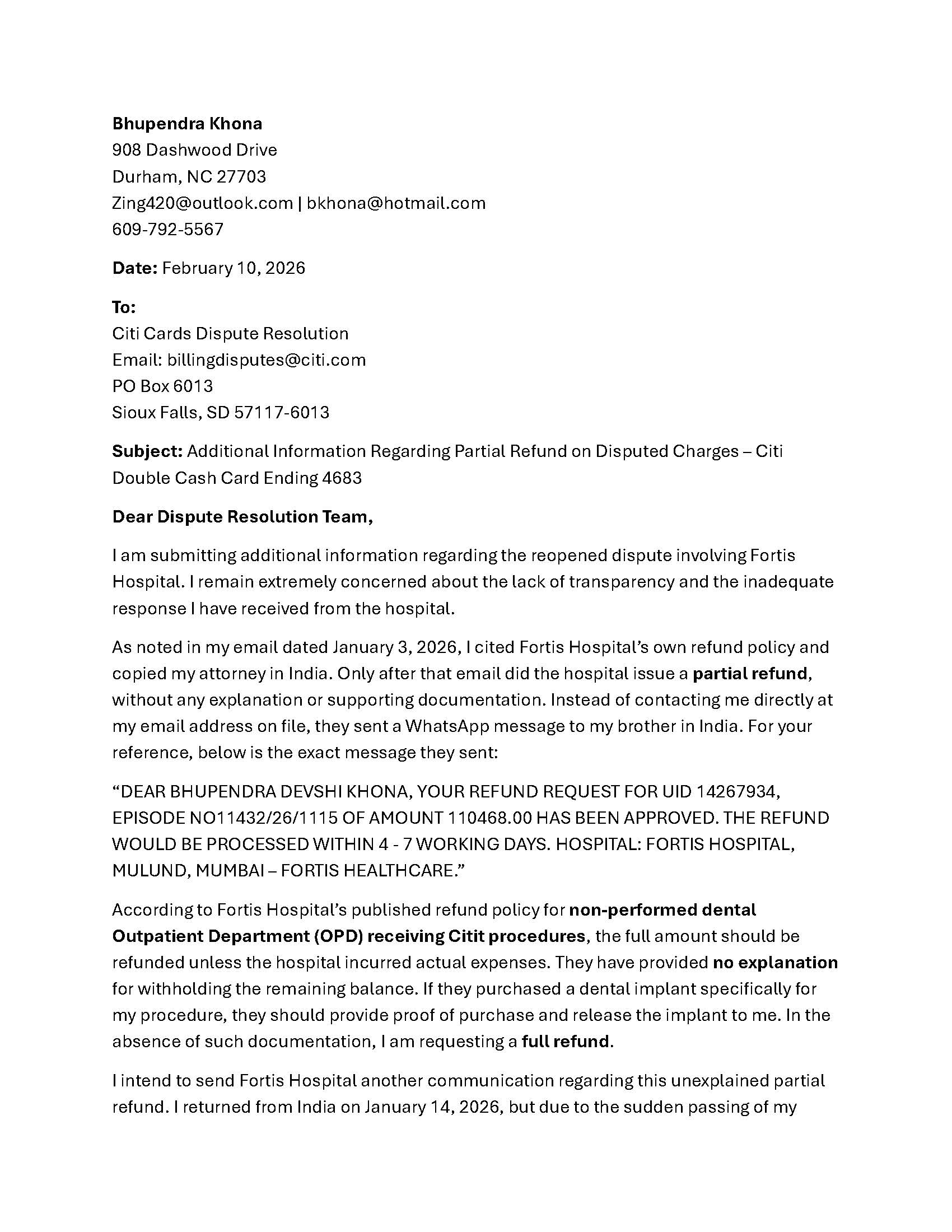 No explanation of why a partial refund was approved. It is just an unprofessional response. I need to know why only a partial refund was approved. Whether doctor Vipin Dhahne incurred any expenses that accounted for almost half of the charges originally charged on December 13, 2025. If he did, I need a breakdown of the charges to be fair. And if he bought an implant or any other item, such as a crown, I would like to take possession of it. I am back in the USA and going through a hard time getting my well-earned money. As a large hospital organization with branches across India, I am truly appalled to see such a practice being allowed. I personally met Ms. Tito Matthew, the head of billing at Fortis Mulund Hospital, and she was extremely cordial. In front of my sister-in-law, she directed her staff, Mr. Swapnil Pawar, to process the refund. I am totally surprised by how things are communicated and coordinated at Fortis.