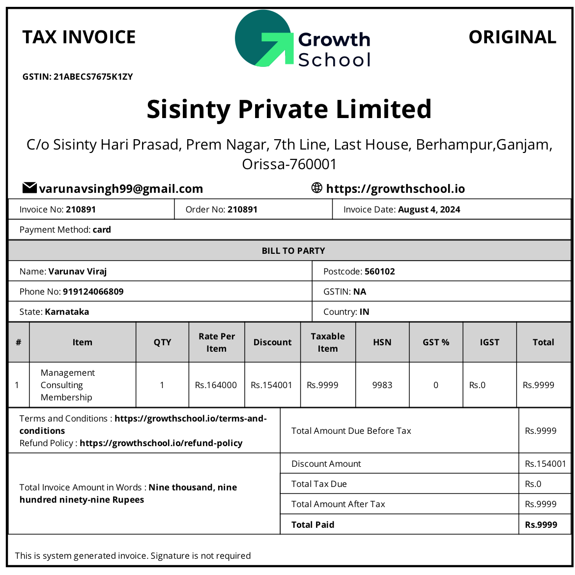 I purchased a course on 4th of August 2024, costing ₹15000, but decided to change my mind and get a refund shortly after that because of some family emergencies. As there were no terms and conditions mentioned on the payment gateway regarding refund, I decided to mail them and attached all the receipts of payment.