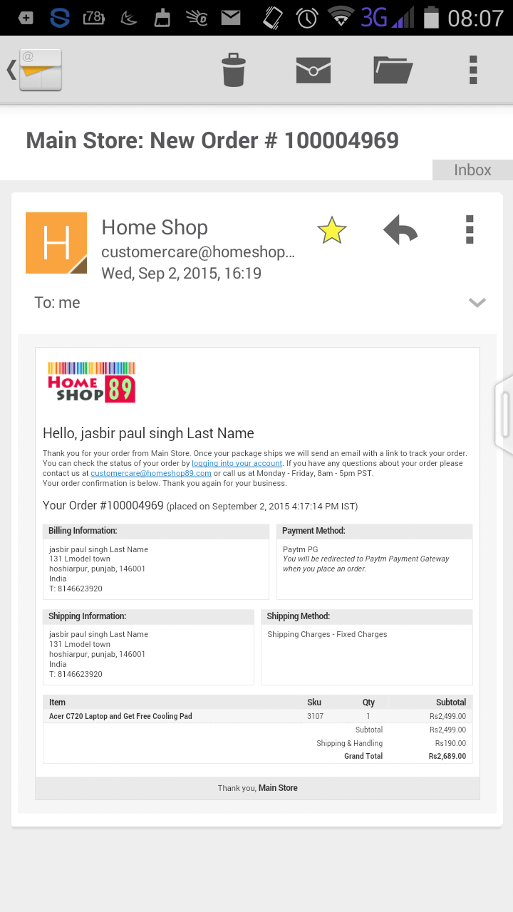 Homeshop89 – order placed but no response after 2nd sept2015Computers & Accessories / Homeshop89 / Leave a Comment / September 11, 2015 September 11, 2015 Against the offer of laptop with free cooling pad I ordered the same on 2nd sept .I sent two emails but I did not get any response till date. order no.100004969.” ACER C720 LAPTOP AND GET FREE COOLING PAD” on the offer to suppli acer laptop with Related reviews:AYUB MIRZA – Ordered TV but not received yetHome shop 89 – Deduct payment But Not recieve ProductHome Shop 89 Bangaluru – AHome shop 89 fraudsters – not received the order yethome shop89 – no order detil given as payment is transfer